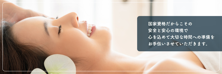 人生のなかでも大切なイベントだからこそ、安心と安全を提供させていただきます。理容室では、ウェディングヘアアレンジや剃刀を用いたブライダルシェービングおよびエステを行い、美容室ではウェディングヘアアレンジ・エステを中心に、お客様に大切なイベントのお手伝いをいたします。