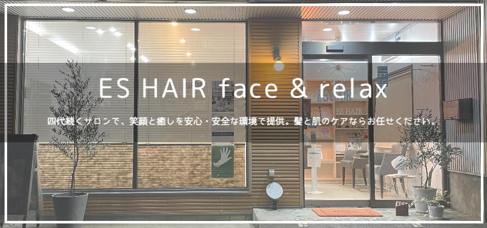 **ES HAIR face & relax にようこそ!** 私たちは、街角の小さなサロンで、四代にわたって「笑顔と癒し」を大切にしています。 「髪と肌のことなら任せて!」という気持ちで、皆さまを心からお迎えします。 リラックスしながら、もっと素敵な自分に出会える場所。それが私たちのお店です。 ちょっとしたおしゃべりや、癒しのひとときを楽しみに、ぜひ遊びに来てください!