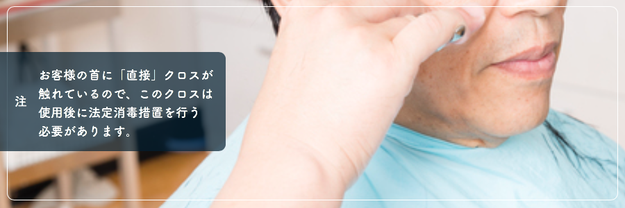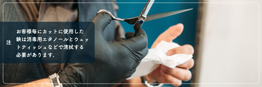 - 道具(鋏・櫛)は使用前に法定濃度のエタノールを噴霧し、ティッシュで表面に付着した脂分を拭き取り乾燥させることにより抗菌作用を高める。
