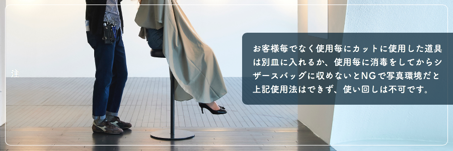 なお、衛生措置を講じた使用方法としては、施術中、使用している器具を消毒した後にシザーケースに収納し器具を消毒してから使用する、又は、使用している器具はそのままシザーケースに収納せずに専用台等に置き、施術終了後に消毒を行った上でシザーケースに収納するといった方法が考えられること。