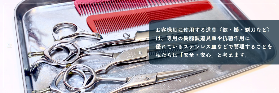 - 消毒した道具(鋏・櫛・クリップ・カミソリ)を収めた汚染されていない(注1)シザースバッグを用いて施術した場合、使用済の道具はシザースバッグに戻さずに、御客様毎の清潔な容器に置いて施術を行う。施術後には、未消毒の道具は消毒を行い汚染されていないシザースバッグに収納する。