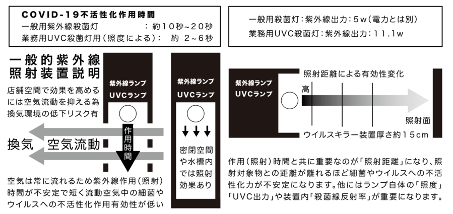 - ウイルスキラー装置は装置内という「空間」を限定させ、UVCにおける「作用時間」「作用距離」と、高出力のランプで装置内の空気に含まれる菌やウイルスを不活性化させた装置内の空気を設置してある店舗内に放出させることにより店内換気と合わせて環境リスクの安全性を導く装置です。