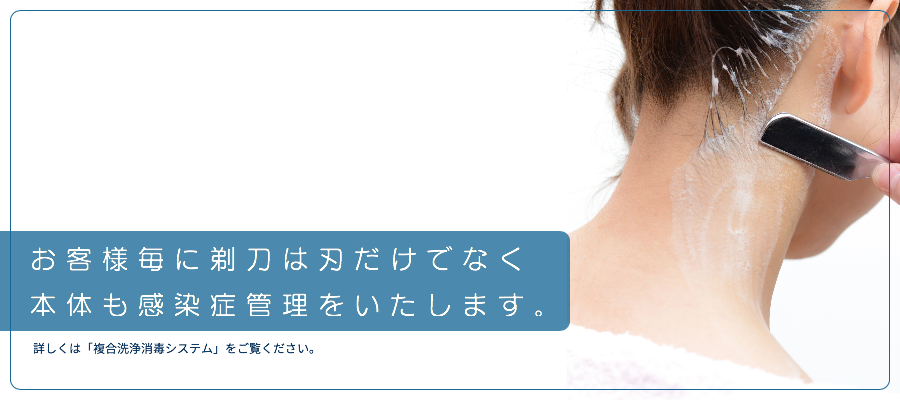 - 剃刀はお客様毎に法定消毒工程を遵守します。お客様毎の替刃交換だけでは「消毒」ではく、あくまでも工程の一部ですので「未消毒」です。
