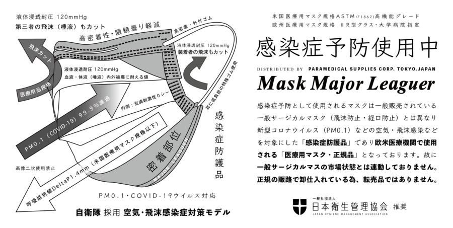 なお、濾過率が高いと呼吸が苦しくなりがちで、そのままではマスクとして実用性に欠けることになるため、米国では濾過率が高いと同時に呼吸が楽(4mmH₂O/c㎡以下)という相反する要素が同時に求められ、マスク・メジャーリーガーは、これらの数値もクリアして防御性能だけでなく長時間装着の快適性にも優れております。