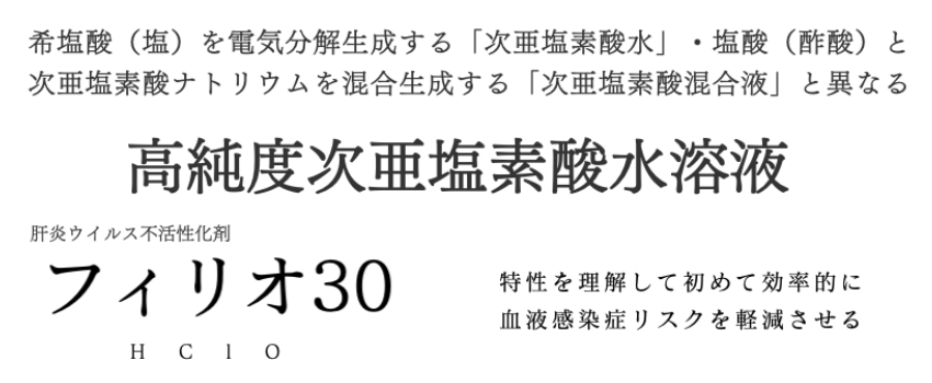 家庭用漂白剤(塩素系消毒剤)6%原液と同じ除菌力をもち、塩酸(酢酸)を使用しない特許生成「弱酸性高濃度高純度次亜塩素酸水溶液フィリオ30」を使用し、菌・ウイルスを速やかに不活性化して法定消毒工程を効率的にいたします。