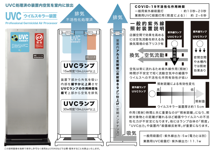 ウイルスキラー装置は装置内という「空間」を限定させ、UVCにおける「作用時間」「作用距離」と、高出力のランプで装置内の空気に含まれる菌やウイルスを不活性化させた装置内の空気を設置してある店舗内に放出させることにより店内換気と合わせて環境リスクの安全性を導く装置です。