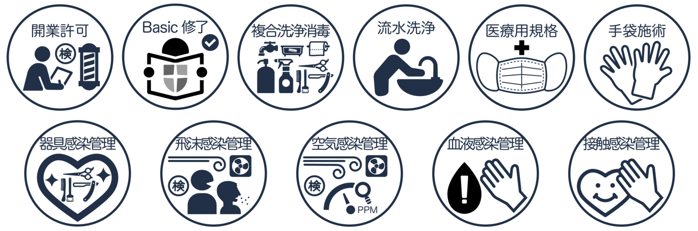理美容師法施行規則規定している消毒方法を遵守しております。理容師法施行規則及び美容師法施行規則に規定している消毒方法で定められている法定濃度エタノール・法定濃度次亜塩素酸ナトリウムなどを法定浸漬時間を含めた消毒工程を遵守することを基本とし、より効果的にする洗浄工程および保管工程を裏付け(第三者検査データを参照)がある薬剤を使用し、システム化したものが「複合洗浄消毒システム」となります。